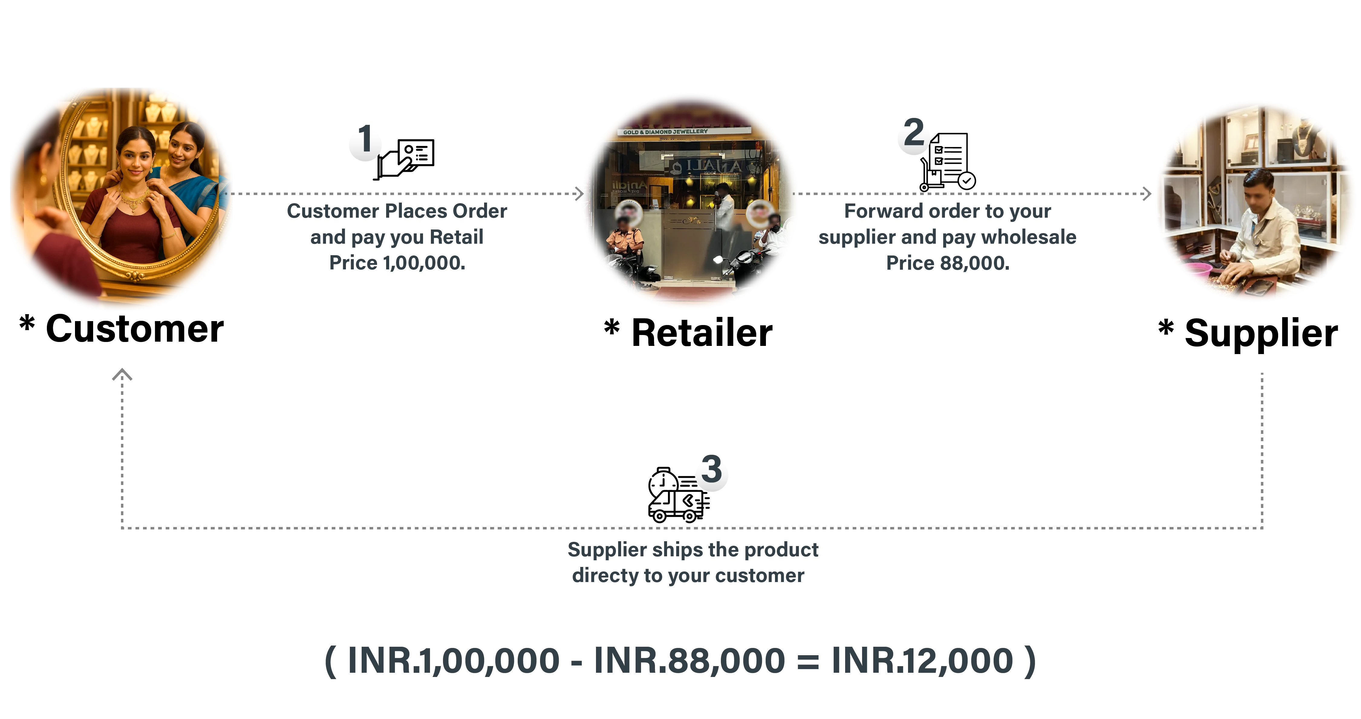 Retailer Forwards the Order – You (the retailer) send the order details to the supplier and pay the wholesale price of INR.88,000.